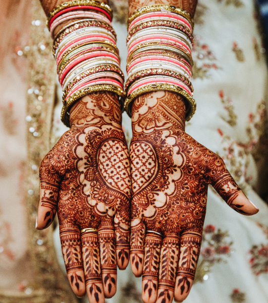 Intricate mehandi designs and elegant hairstyling complete the bridal look. Each detail is crafted to highlight tradition, personality, and the grace that every bride embodies on her big day.